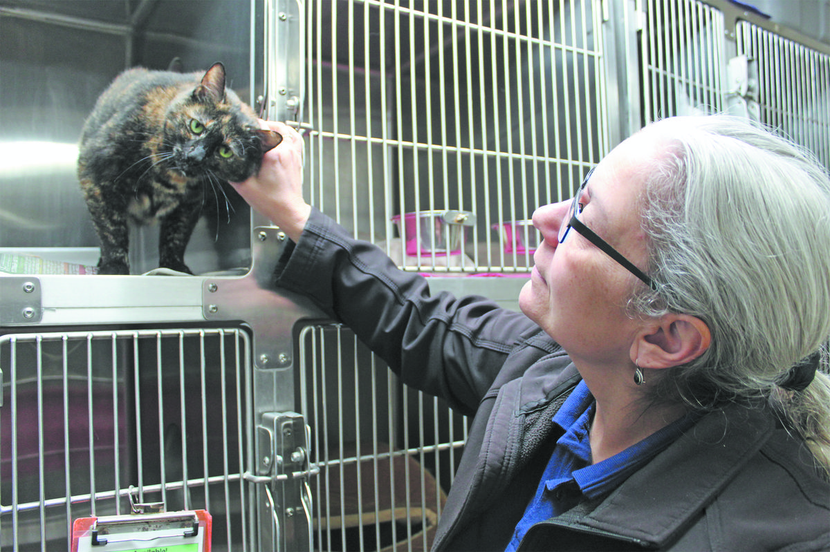 Chico Animal Shelter’s Tracy Mohr pets a tortoise shell cat that likely will be put up for adoption soon.