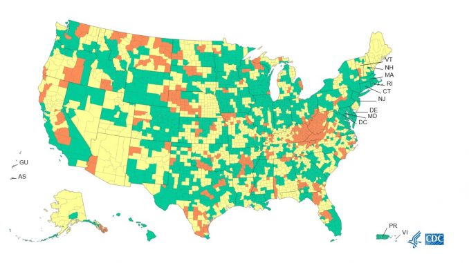 Only because the CDC changed their metric from 50 cases per 100,000 to be high community spread to 200 cases for 100,000 for high community spread.