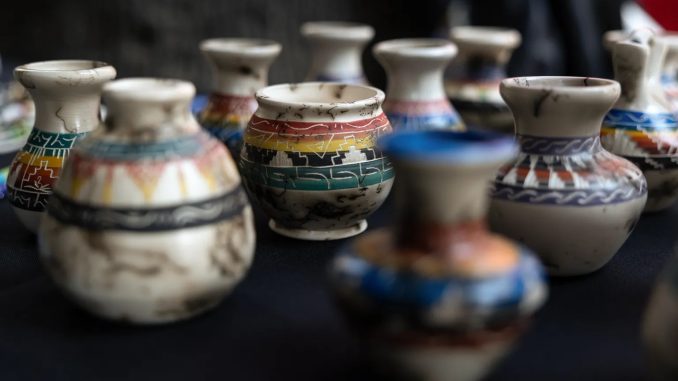 A vendor sells pottery items at the California Native American Day celebration at the state Capitol on Sept. 22, 2023. (Photo by Miguel Gutierrez Jr. for CalMatters)