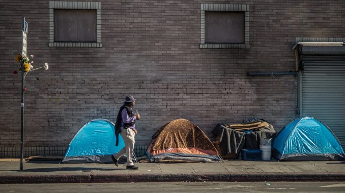 A person walks by a homeless encampment in downtown Los Angeles. (Photo by Larry Valenzuela for CalMatters/CatchLight Local)