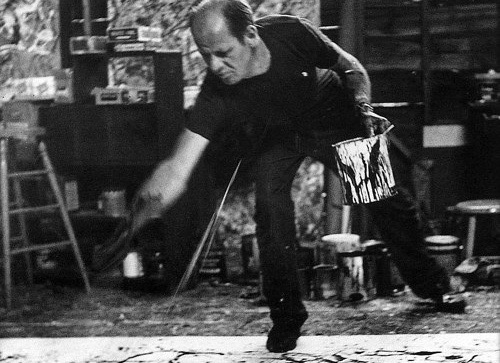 One day in 1946, Pollock began doing something never done in the history of art. He took large canvases off the wall, laid them on the floor and dripped over the untreated fabric with streaming colors of pigment. Using rhythm, gravity and velocity, he made paintings without ever touching a brush to canvas. As Motherwell put it, “Pollock literally danced over the canvas and the paintings are the trails of his dance.”