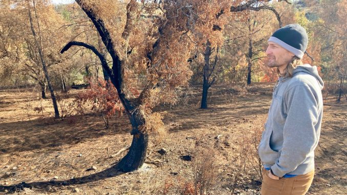 Steven Clipperton stands in the parking lot of the Chico Community Observatory in Upper Bidwell Park, pointing eastward towards the burn scar of this summer’s devastating Park Fire.