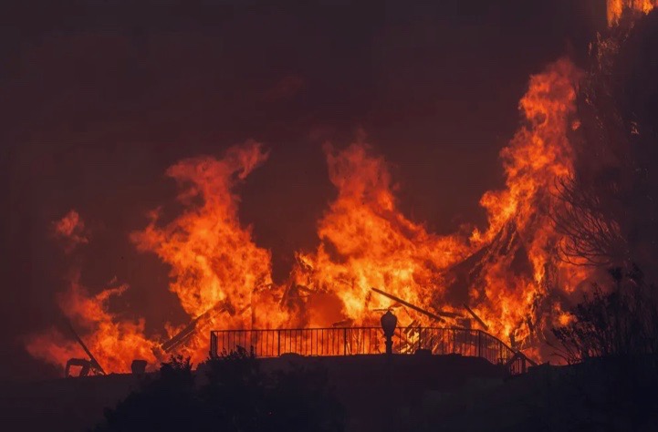 A home burns during the Palisades Fire near Pacific Coast Highway in Los Angeles. Photo by Ted Soquil for CalMatters