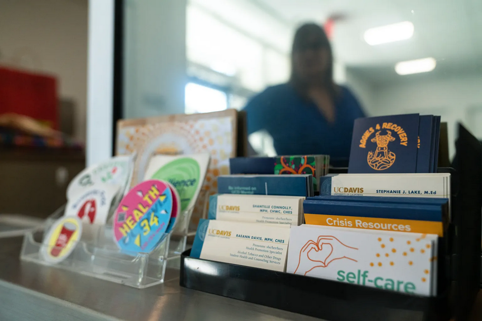 A shelf displaying stickers, business cards, and QR-coded informational materials for students struggling with substance abuse and addiction in the Cowell Building lobby at UC Davis on Aug. 1, 2024. Photo by Louis Bryant III for CalMatters